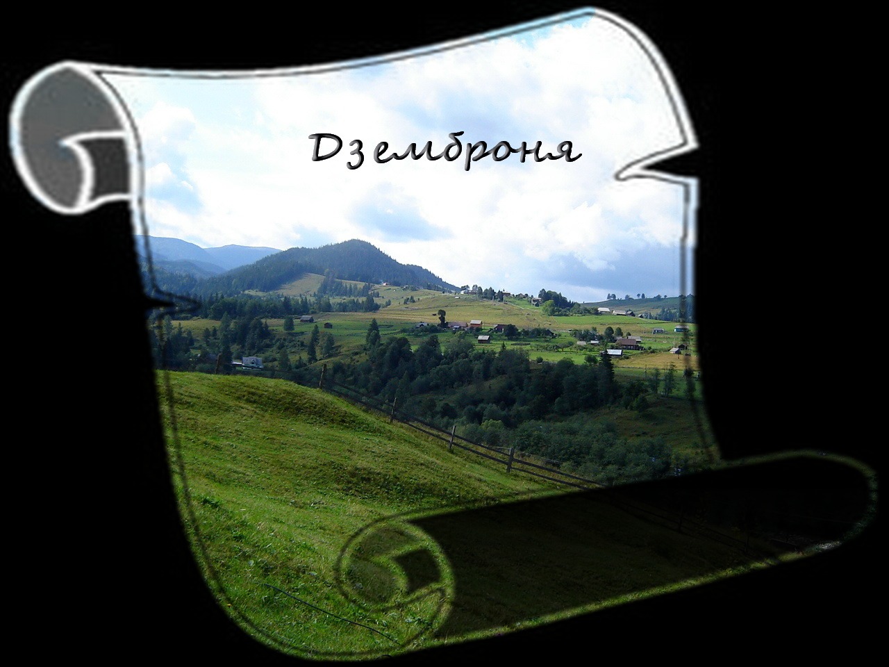 Коровы- альпинистки, карабкаясь  по горам,   пощипывают травку.  И название села позванивает в ушах, как колокольчики у них  на шеях: «Дзень-бронь,  дзем-бронь» . Дземброня. Откуда  такое название? Пока нет единого мнения. Кто считает, что здесь когда-то водились зубры  /«зембры»  по-польски/, кто склоняется  к мысли, что эта земля названа в честь землевладелицы этих мест польки Брони. Чия земля?  Це — Броні!