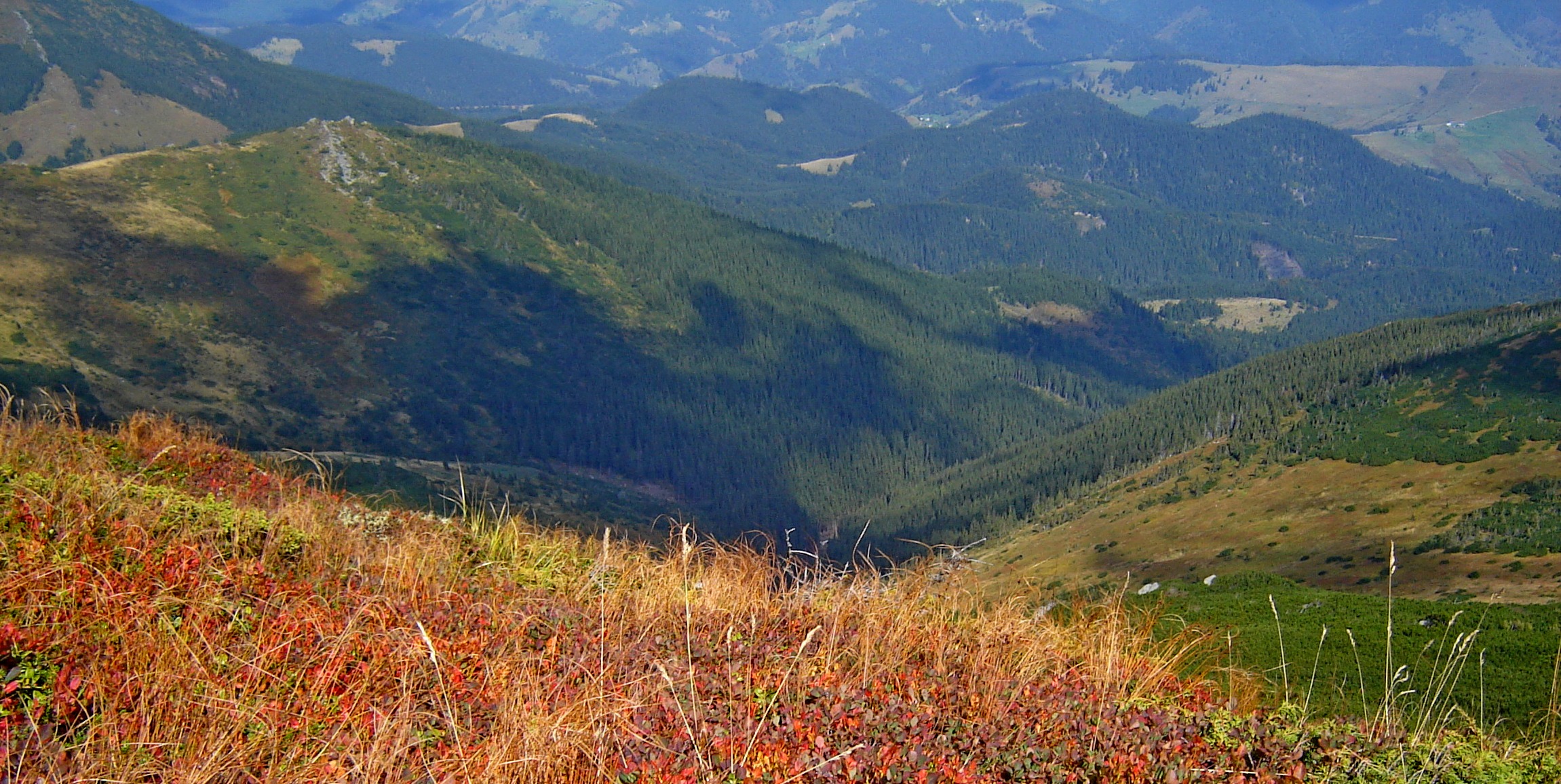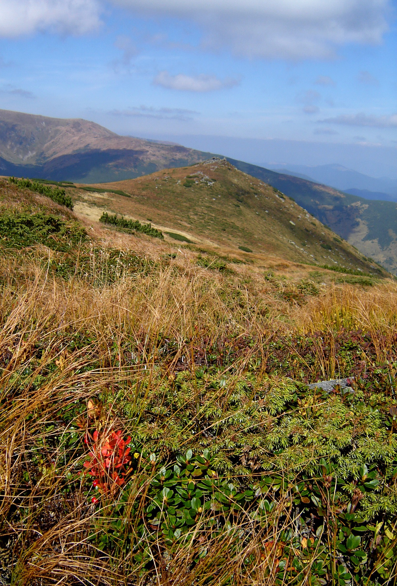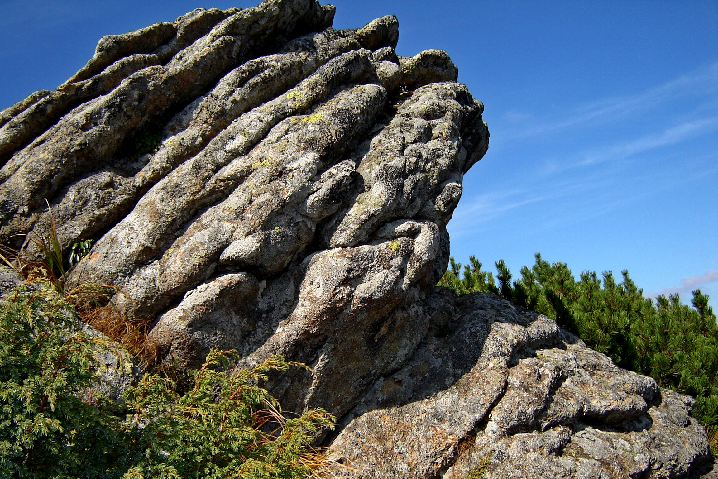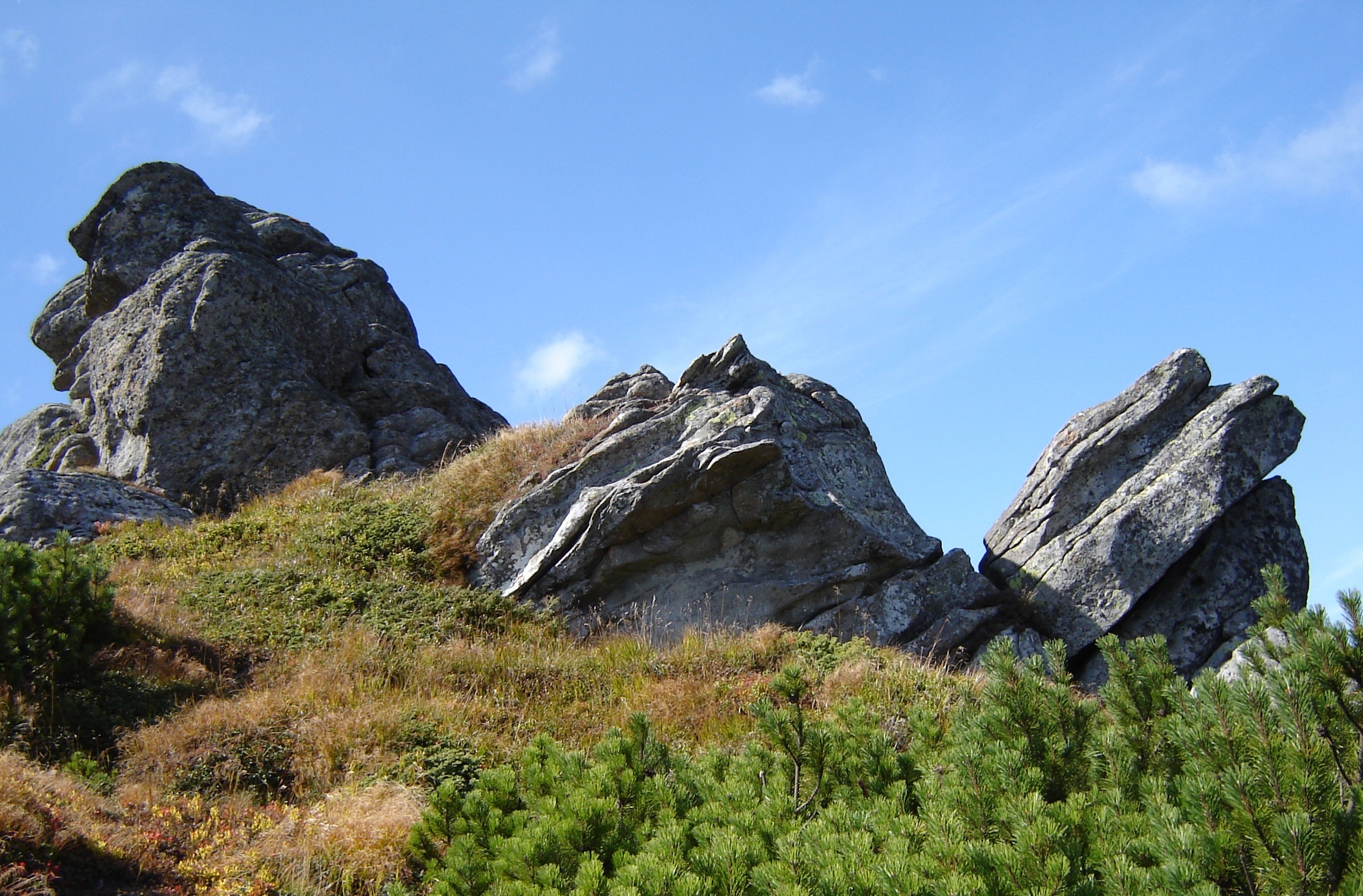 Водопады,  поросли  розово-фиолетового   рододендрона  — рядом с  которым  еще  не растаял снег, целые поляны  ярко-желтого лютика на фоне  сочно-зеленой  травы,   вершина  горы Вухатый Каминь , где  ветер  наворотил  разные  каменные фигуры:  одна похожа  на   птенца, другая  на аллигатора,  третью так  и называют  «Дед и баба». Они возвышаются  среди  жерепа — карликовой  сосны или альпийки  /ну  очень похожа на  чукотский  стланик!/. Жереп  почему-то двухцветный, зеленый  и рыжий. Очень красиво и неожиданно…