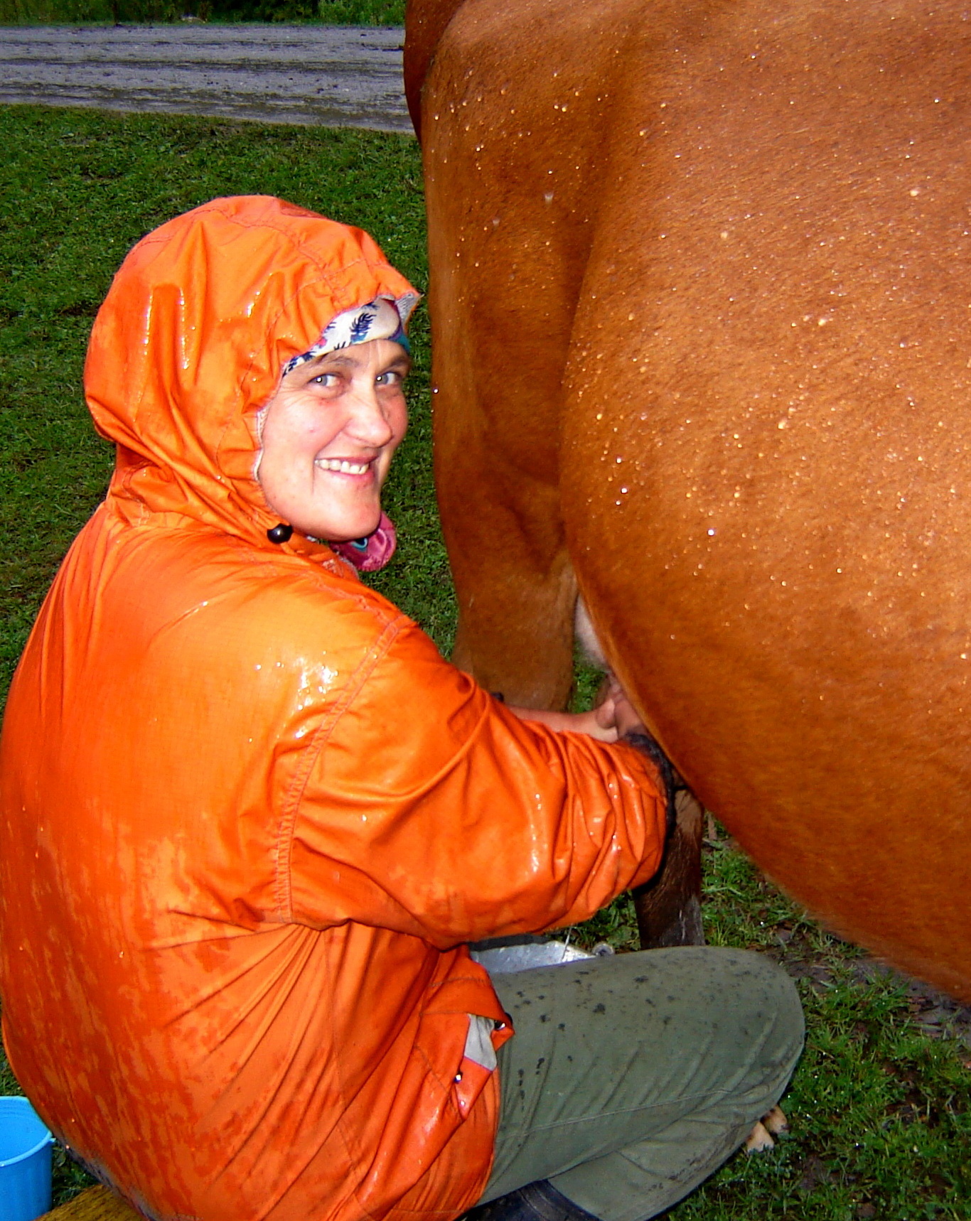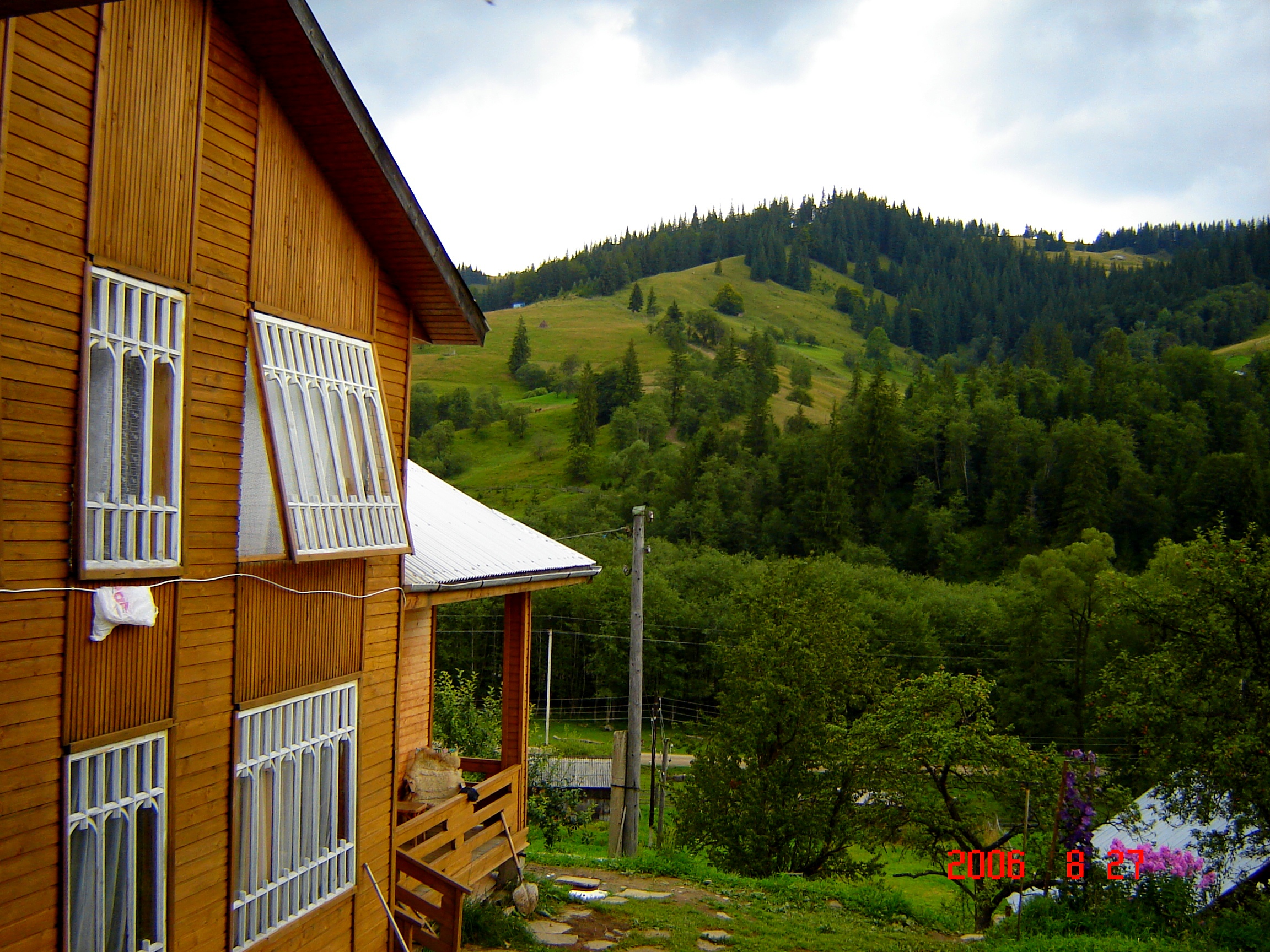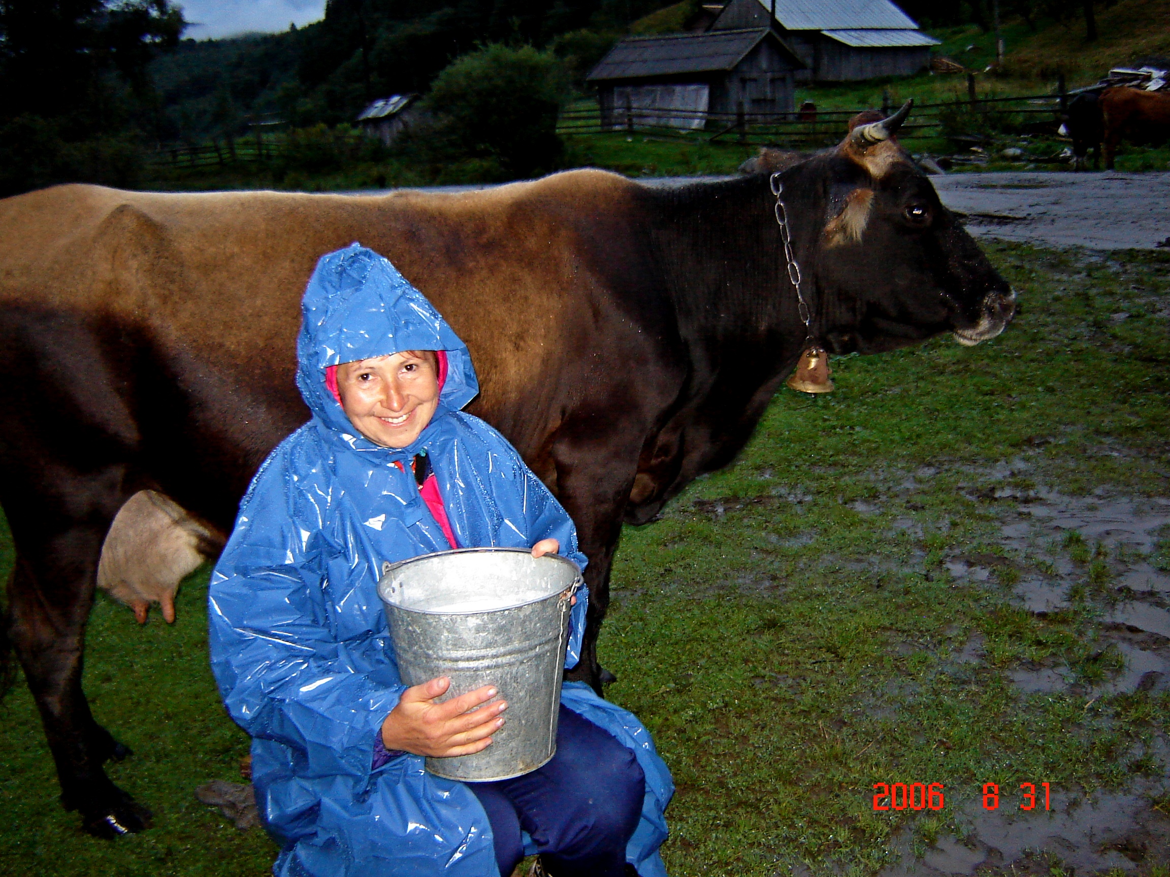 Мы отправляемся в Быстрец – соседнее село  —  в гости к Маричкиной знакомой.   Предстоит  шесть  часов  пути  / туда  — через  хребты,  чтоб быстрее , назад  — по грунтовой  дороге, чтоб проще /.  Мои брюки  еще не просохли после вчерашнего дождя     и нет было надежды, что они вообще когда-нибудь просохнут  /дожди идут уже несколько дней и достаточно напитали воздух влагой/. Кое-как  в Маричкином гардеробе нашли  подходящую для меня  по размеру  одежду — непромокаемые стеганые… ярко-красные /!/  штаны. В таком революционном виде я еще не путешествовала…