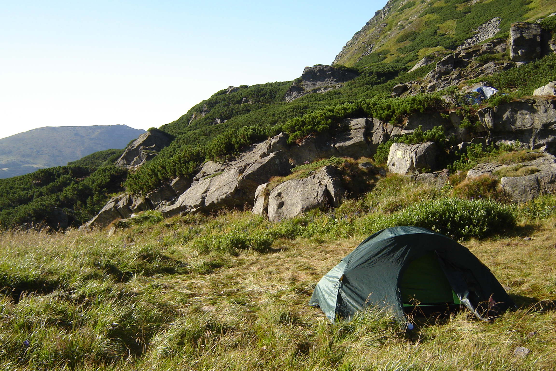 Я даже не огорчилась, что, пробираясь через густой жереп (альпийку или карликовую сосну), потеряла свой плащ. Это облегчит мою ношу J. А дождя на маршруте не будет. Или он пройдет ночью, когда я — под защитой палатки и тента над ней.