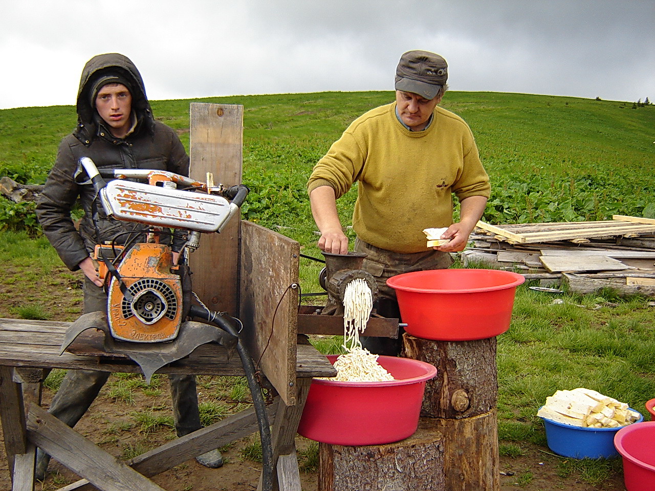 Прокопченный сыр пропускают через мясорубку. У Гаджуков она с механическим приводом 😉 – работает на бензопиле.