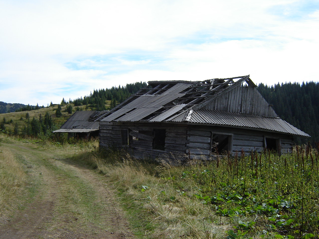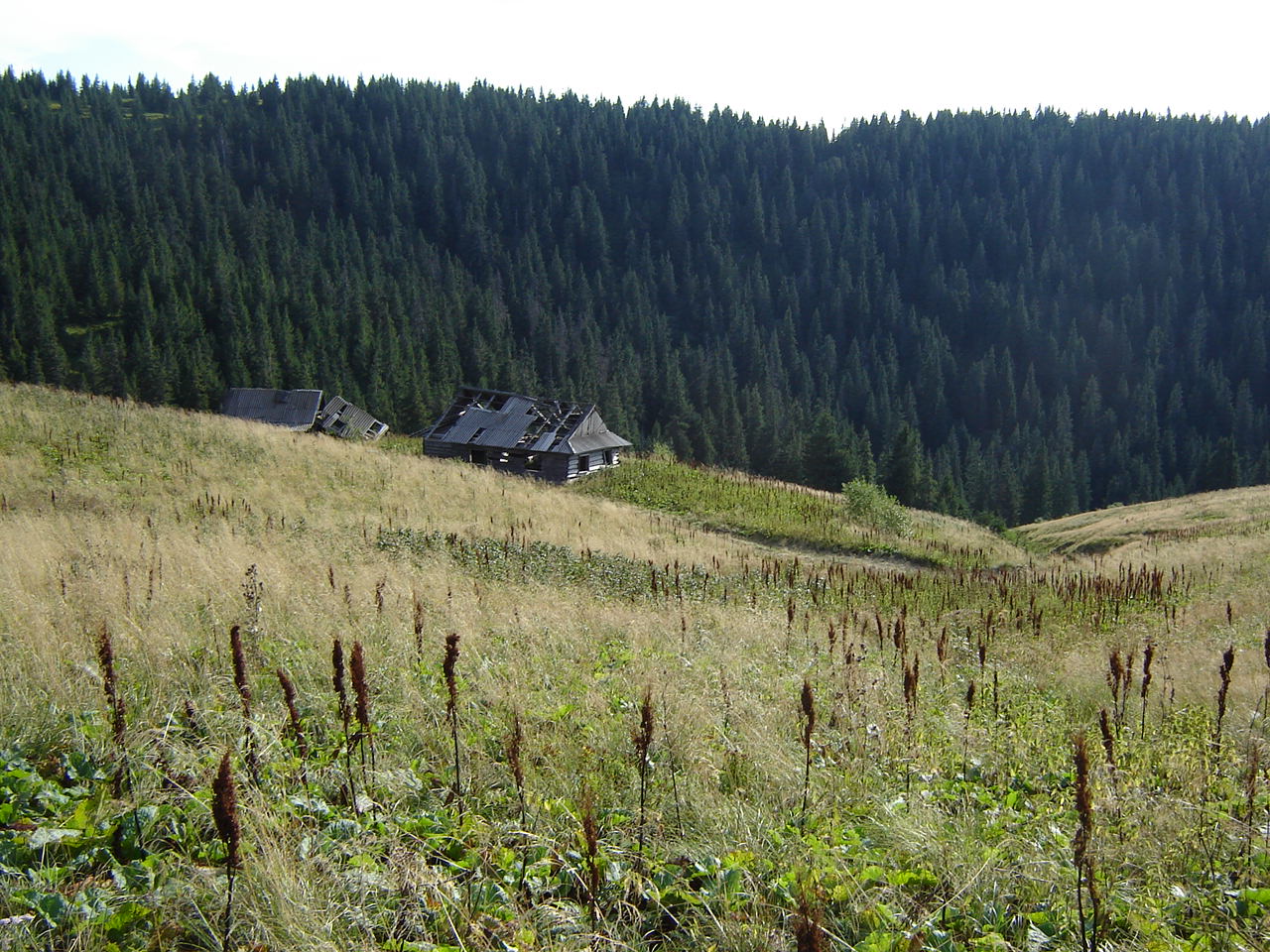 С помощью пограничника, совершающего объезд территории, я довольно быстро нашла источник воды, но поставить палатку на этих пологих склонах практически невозможно. Единственное более ли менее ровное место (исключая дорогу, по которой подвозят и увозят заготовителей) – между двумя полуразвалившимися стаями (стая – это избы пастухов на полоныне).