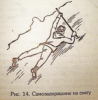 «Если покатился вниз, надо стремиться сразу перевернуться на живот, головой вверх, и задерживаться палкой в положении лежа. То есть вонзать ее штычек в снег, как бы цепляясь за него. Ноги при этом нужно держать широко раздвинутыми и ступнями упираться в склон, замедляя падение».