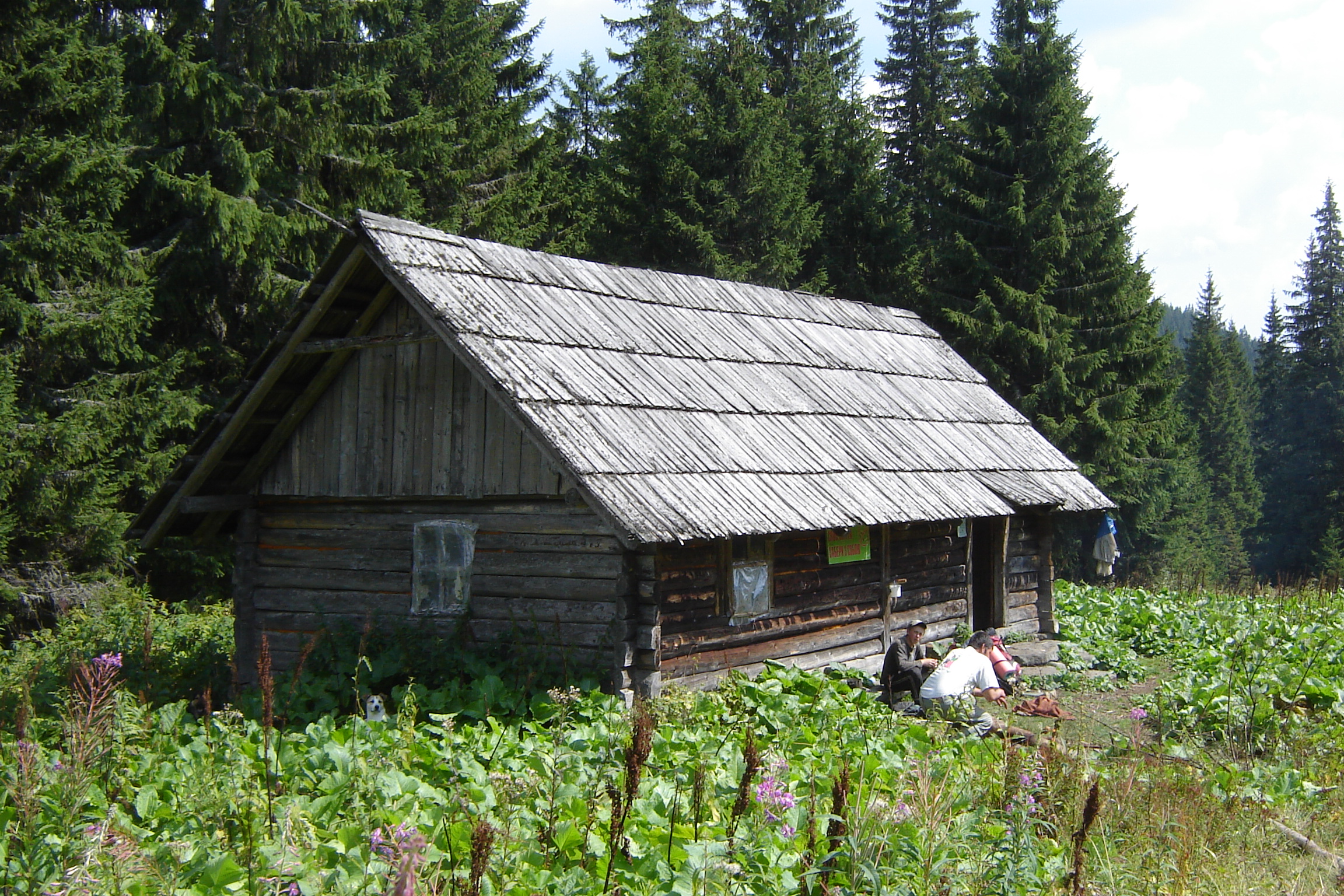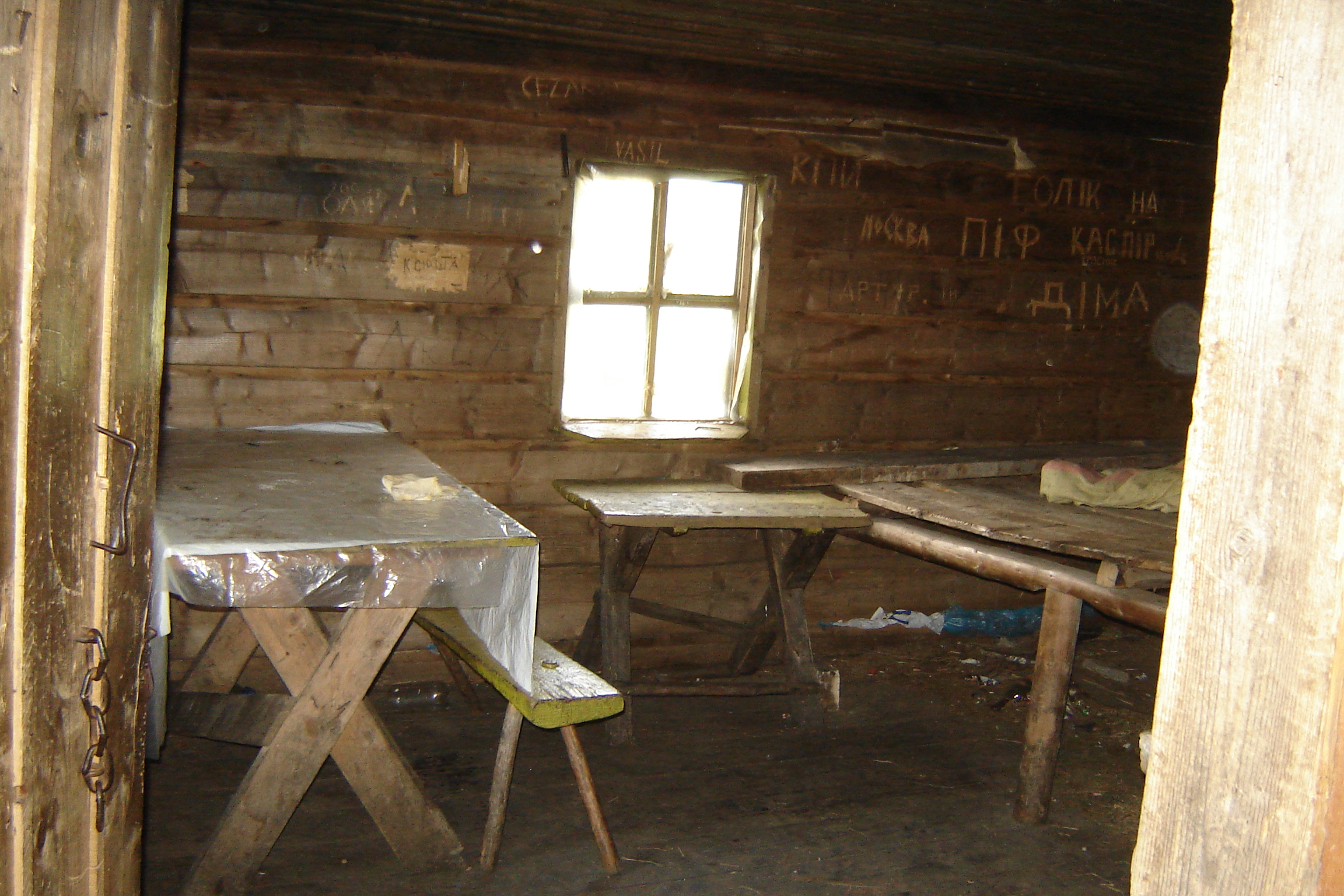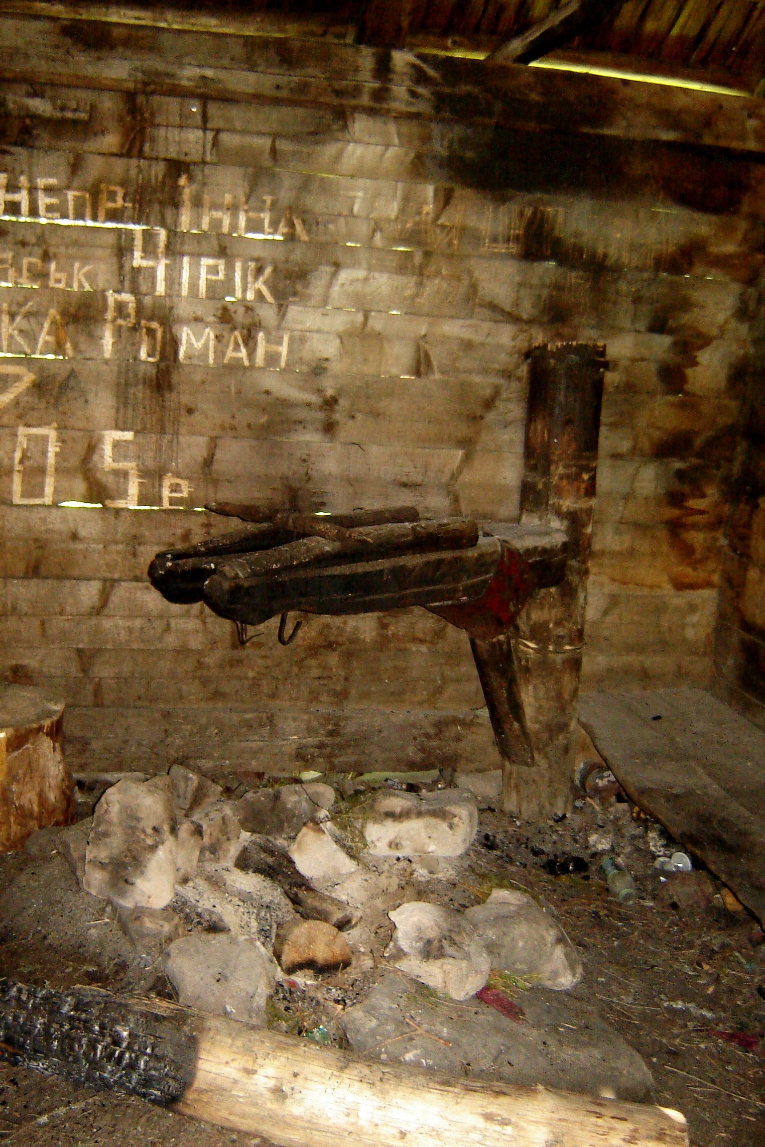 В избушке когда-то жили чабаны, выпасавшие скот на полоныне Шешорской, но теперь хата пустует даже летом, хотя она показалась мне вполне пригодной для жилья: берфела (приспособление на которое цепляют большой чан для изготовления сыра над костром), полати, стол, лавки… По крайней мере, туристам есть где переждать грозу и переночевать в тепле и сухости.
