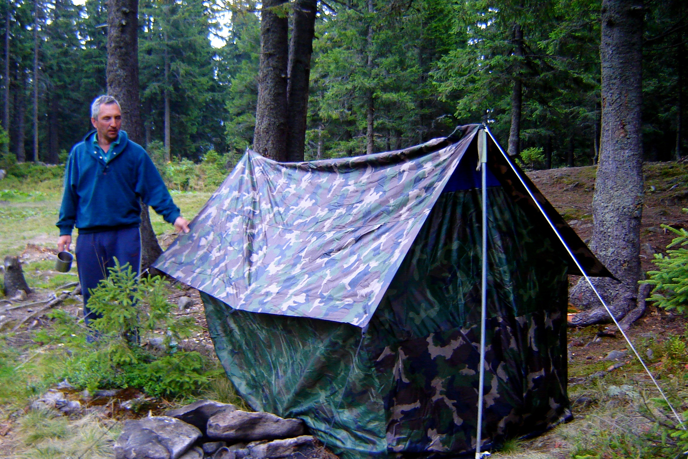 Как следует рассмотрела Володину палатку. Он перешил ее из старой и дополнительного материала. Говорит, что весит это двухместное чудо всего 1 кг. Прямо не верится… Впрочем, экономия веса достигается, видимо, благодаря отсутствию дужек. Опорами для самодельного матерчатого домика служат обычные трекинговые палки. Во время стоянки ведь они не нужны. Ай да Володя!