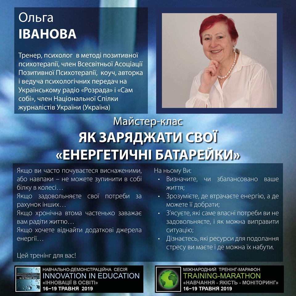 Сертифицированный психолог (в методе позитивной психотерапии), член Всемирной Ассоциации Позитивной Психотерапии, сертифицированный коуч, член Союза журналистов Украины, автор психологических передач на Украинском радио («Розрада», «Варіант», «Сам собі») Ольга Иванова.